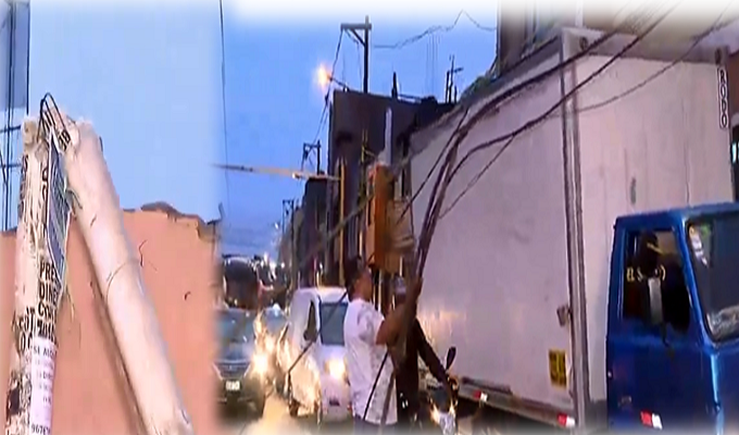 En la cuadra 3 del jirón Virú en el Rímac con dirección a San Juan de Lurigancho (SJL), dos postes se cayeron y ocasionan congestión vehicular en la zona.