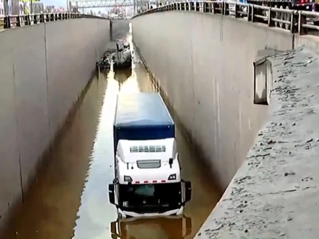 Huachipa: camión queda atrapado en medio de bypass inundado por las lluvias