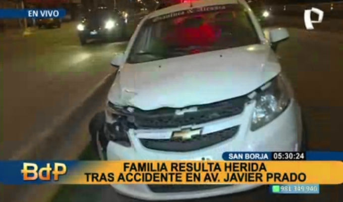 La madrugada de este lunes, un auto con una familia a bordo se despistó y terminó estrellado contra el cerco metálico de la berma central, a la altura de la cuadra 33 de la avenida Javier Prado, en el distrito de San Borja. Se desconocen las causas del fatídico accidente.