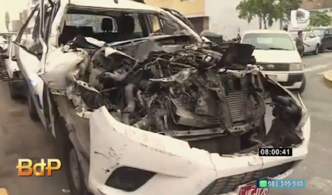 Uno de los patrulleros de la la Municipalidad de La Victoria quedó completamente destrozado tras impactar con un camión de basura en la avenida México durante la madrugada de este miércoles.