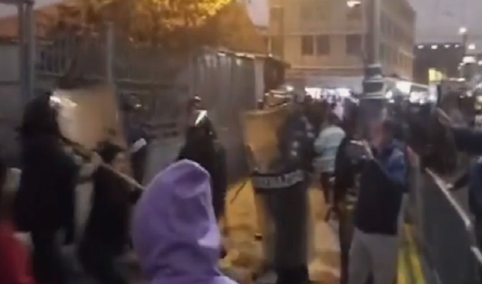 Aproximadamente 30 ambulantes ubicaron en esta parte para intentar retirar las rejas metálicas que se ubican en este punto, e inclusive una señora hizo uso de un palo de madera para golpear a los fiscalizadores.