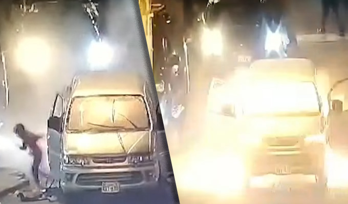 El incidente fue registrado en la calle Alfredo Mendiola, en Los Olivos, y las cámaras del lugar registraron la veloz reacción de los comerciantes y el menor, que fue el ultimo en salir de la minivan a menos de un segundo que se registrara la explosión.