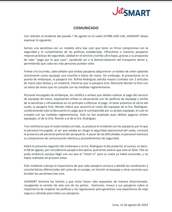 Las cámaras de Buenos Días Perú llegaron hasta la vivienda de los familiares de la señora Rufina de 71 años. La denunciantes señala que perdió el vuelo porque no pudo pagar S/7.30 de sobrepeso de sus maletas; sin embargo, lo que ella está denunciando es que la empresa Jet Smart la ha clasificado como una persona no grata, debido a esta situación, ya que ella ha denunciado el hecho ante la comisaría y ahora simplemente no puede abordar ningún avión de esta aerolínea. Sumado a esta preocupación, está el hecho que ha perdido sus citas médicas, que incluye intervenciones quirúrgicas.