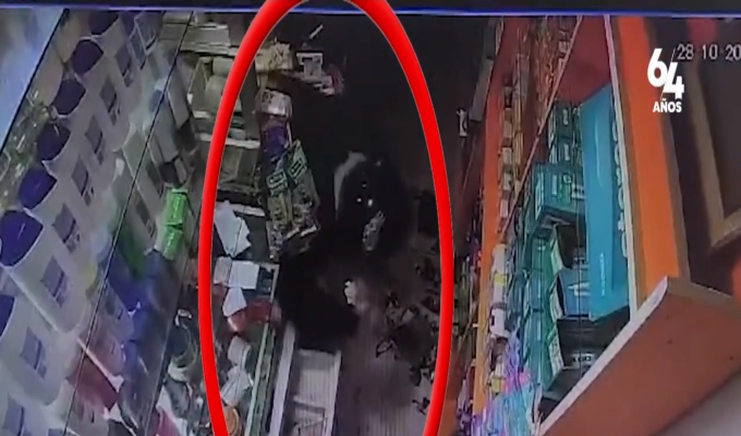 Las cámaras de seguridad del establecimiento captaron el preciso momento en el que ladrón comienza a romper los vidrios del local con su arma de fuego con la finalidad de apoderarse del botín.