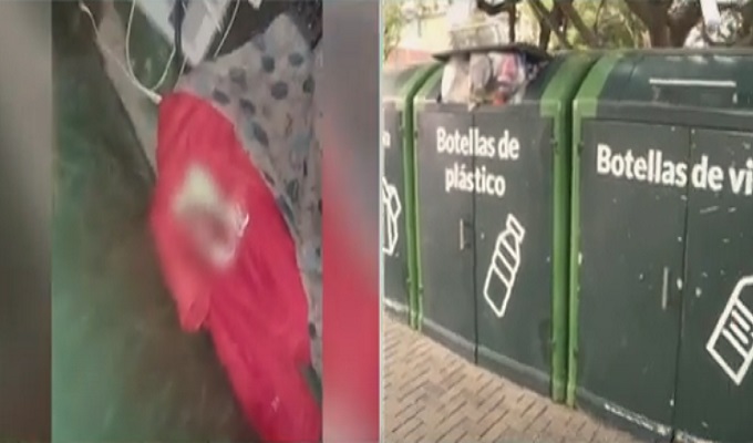 En imágenes captadas por las cámaras de seguridad del distrito, se muestra el momento en que la policía rescata al bebé, que estaba envuelto en una casaca y ubicado en el interior del contenedor, junto a otros dispositivos electrónicos y objetos.