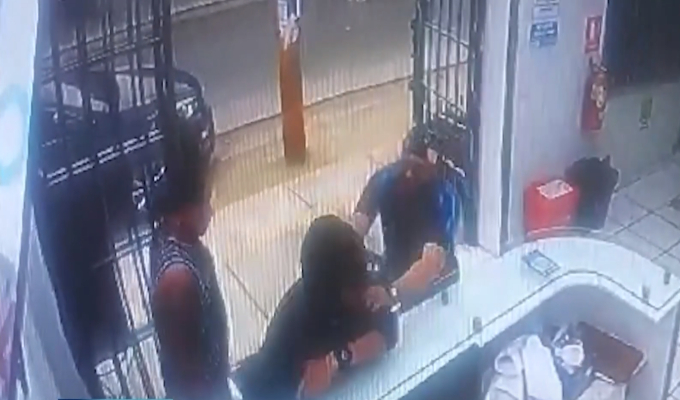 En las imágenes que captaron las cámaras de seguridad del establecimiento se observa como el personal de salud observa al ladrón con una pistola y sin temor alguno le propina un empujón para que cayera en el pavimento.
