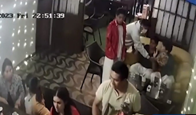 Los comensales sorprendidos, miran nerviosos al igual que el trabajador que solo puede mirar como le arrebatan los celulares a cada uno de los clientes.