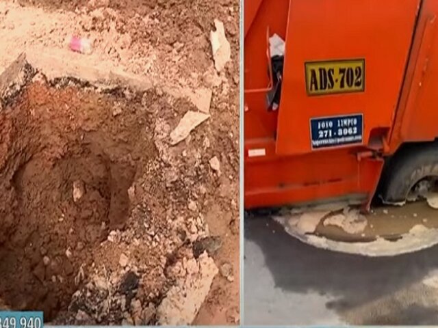 Los vecinos de la urbanización Alcides Vigo Hurtado, en Surco, denuncian la aparición constante de enormes huecos en la vía, generando riesgos para la seguridad vial. Esta vez, un camión recolector de basura quedó casi volcado debido a la hundimiento de la pista.