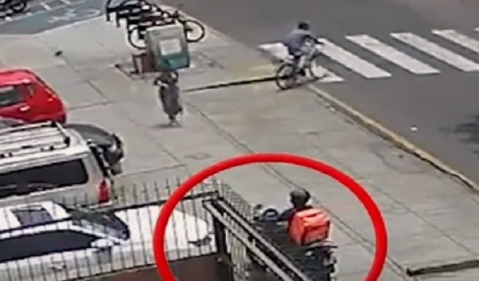 Un falso deliveryasaltó a una joven que salía a botar la basura en San Borja. Cámaras de seguridad captaron a un hombre, que aparentaba ser un repartidor detenido en un punto, simulando buscar una dirección mientras vigilaba los pasos de la mujer que luego de botar basura fue abordada por el delincuente.