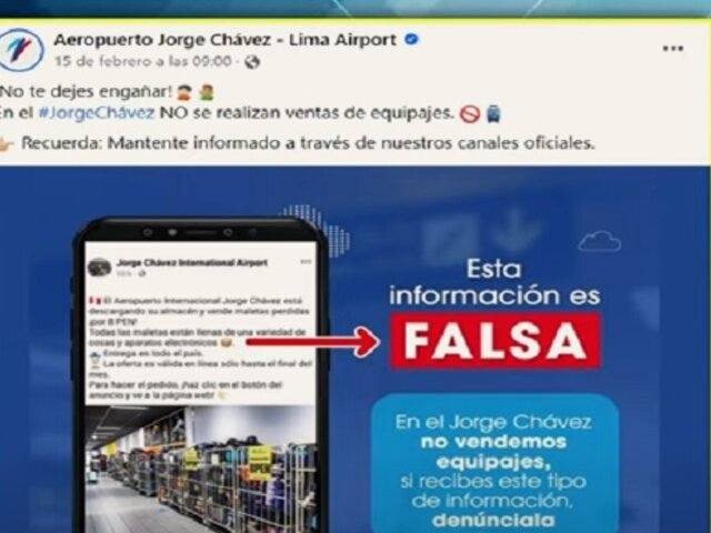 Las autoridades del Aeropuerto Internacional Jorge Chávez han confirmado a Buenos Días Perú que se trata de gente inescrupulosa que usa su nombre en internet y que no existe la posibilidad de comprar maletas olvidadas por error. Es importante tener cuidado y verificar la autenticidad de las páginas antes de realizar cualquier transacción en línea; por ejemplo, todas las redes sociales del aeródromo tienen un check azul, símbolo de su verificación como corporación.
