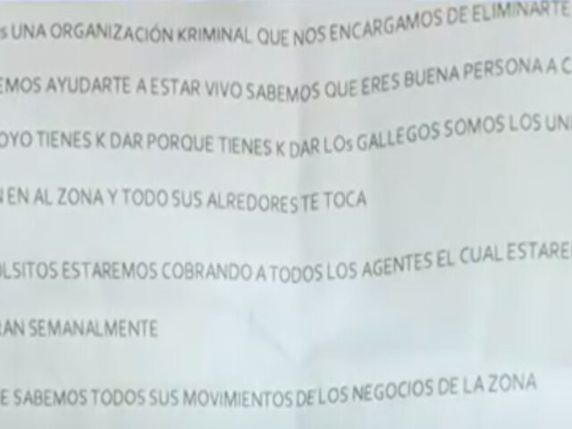 El blanco de estas amenazas es un próspero negociante quien hoy no puede vivir tranquilo debido a que aparentes integrantes de ‘Los Gallegos’, facción de la sanguinaria organización criminal el tren de Aragua, le vienen exigiendo el pago de 500 soles para no atentar contra su negocio y no acabar con su vida.
