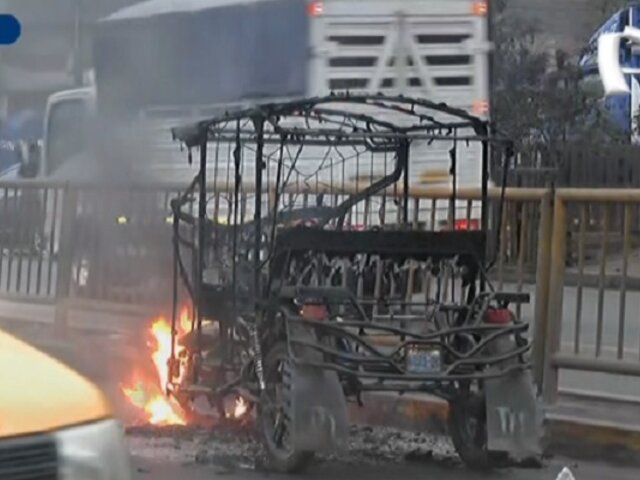 Esta mañana se registró una mototaxi fue completamente calcinada frente al Mercado de Frutas, ubicado en la avenida Circunvalación, en La Victoria. El hecho ha generado preocupación entre los comerciantes y vecinos, quienes temen que se trate de un acto de extorsión.