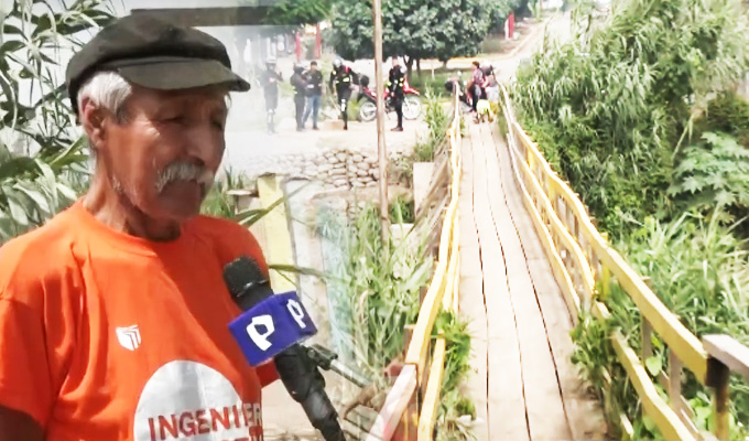 El señor, Hilber Domínguez es un comerciante del lugar y ante la crecida del río, cruzar con su mercadería le resulta más difícil. el puente tiembla hasta llegar al otro extremo