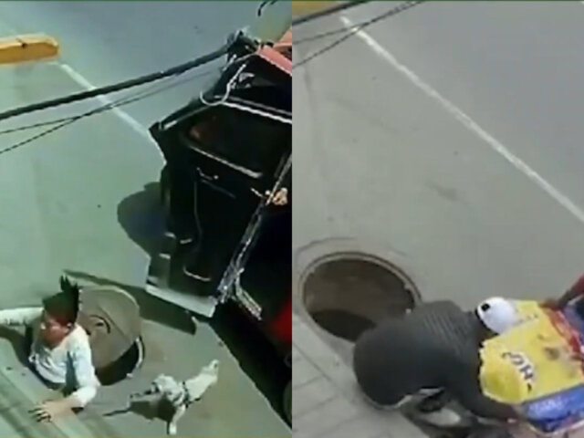 Cámaras de seguridad captaron el preciso momento en que la mujer bajó de una mototaxi y caminó algunos pasos para ingresar a la veterinaria, cuando cayó estrepitosamente al pisar la tapa de madera provisional.