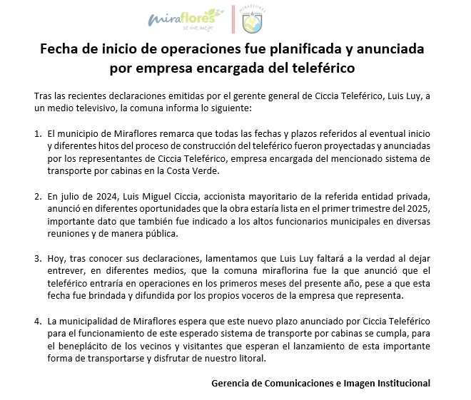 Tras las recientes declaraciones del gerente general de Ciccia Teleférico, Luis Luy, el municipio de Miraflores aclaró que las fechas y plazos relacionados con el inicio y avance del proyecto de teleférico en la Costa Verde fueron establecidos por la empresa concesionaria.