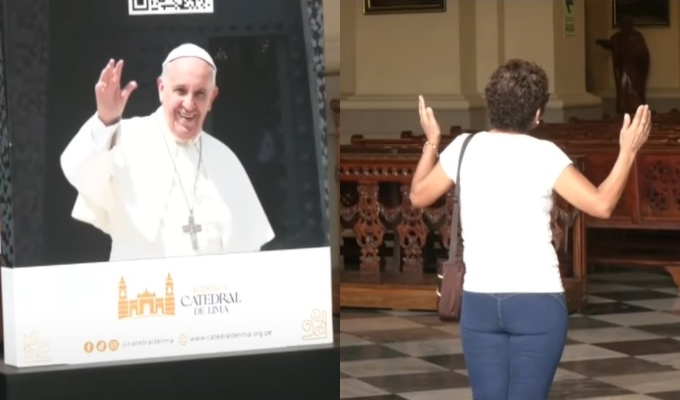 En los exteriores de la Catedral de Lima se han colocado imágenes con el rostro del papa y algunas de sus frases más célebres. Además, se observa la bandera del Vaticano a media asta en señal de duelo.