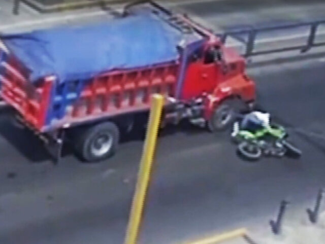 En el distrito de Comas, un motociclista perdió la vida tras ser arrollado por las pesadas llantas de camión volquete. Una cámara captó el fatídico momento cuando el motorizado parece acelerar y termina cayendo de su unidad siendo embestido por el camión de carga.