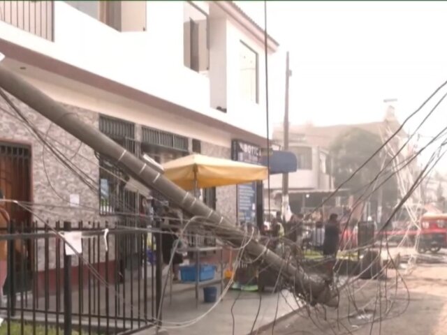 Dos postes de telecomunicaciones fueron derribados por el conductor de un camión recolector de basura. El hecho ocurrió en el cruce de las calles Las Palmeras y Madre Selva, en Santa Anita, y estuvo a centímetros de impactar una vivienda.