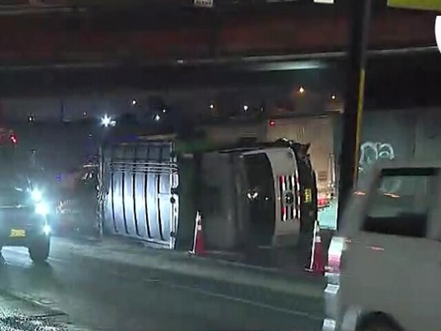 Un camión recolector de basura terminó volcado la madrugada de este martes en la Vía de Evitamiento, a la altura del puente Ricardo Palma. El accidente, que ocurrió alrededor de las 3 a.m., provocó el cierre parcial de la vía y una fuerte congestión vehicular en plena hora punta.