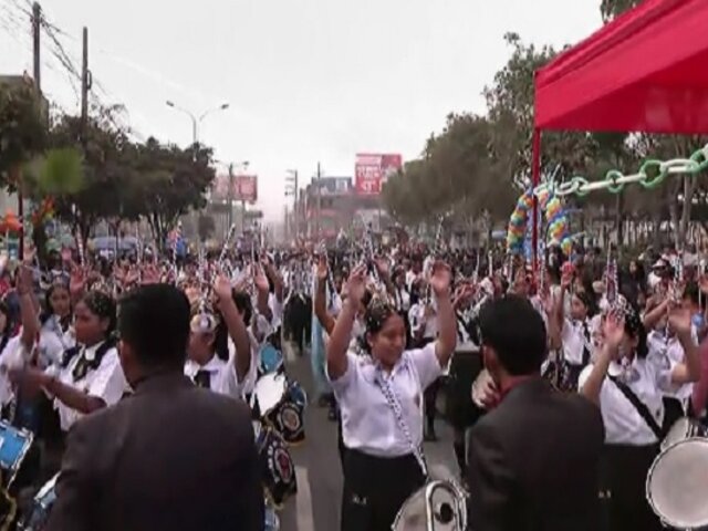 Decenas de colegios participaron en la tradicional jornada cívica en Ate. Padres, alumnos y vecinos se congregaron en la avenida principal desde tempranas horas.