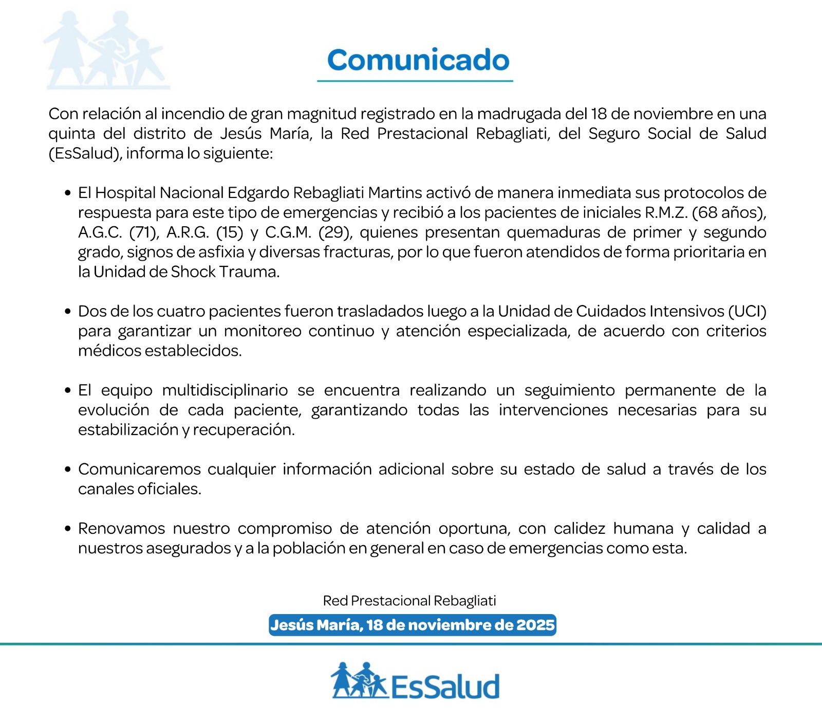 A través de un comunicado, el Seguro Social de Salud (EsSalud), informó que se activaron los protocolos de respuesta de forma inmediata para atender a los heridos, quienes presentan quemaduras de primer y segundo grado.