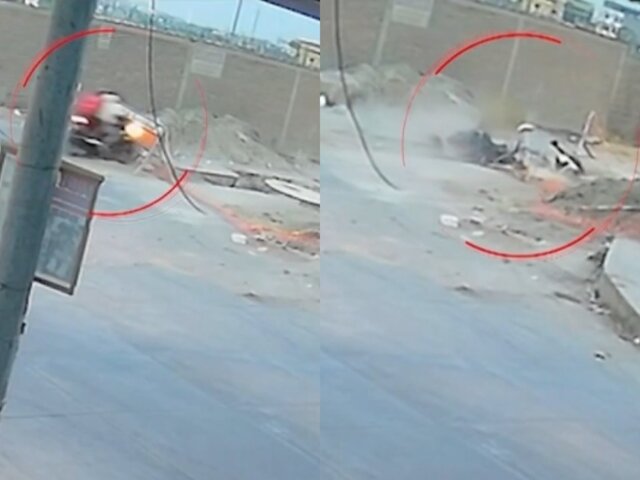 Cámaras de seguridad captaron el preciso momento en que dos hombres que circulaban en una motocicleta cayeron tres metros abajo en un forado en la calle Los Artesanos, en el distrito de Villa el Salvador.