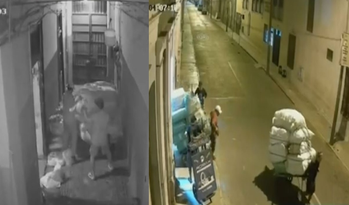 Las cámaras de seguridad registraron cada movimiento de los delincuentes, quienes llegaron con capuchas y gorras para evitar ser identificados. En las imágenes se observa cómo ingresan y salen repetidas veces del almacén, trasladando costales llenos de mochilas en carretillas, simulando ser trabajadores de la importadora.