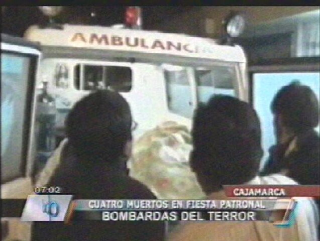 El hecho ocurrió en la provincia de San Marcos, cuando se realizaba un espectáculo de fuegos artificiales por la fiesta patronal. Según los testigos una chispa cayó en una de las bombardas que estaban cerca a un barril de combustible lo que generó la explosión y la muerte instantánea de cuatro personas y decenas de heridos.