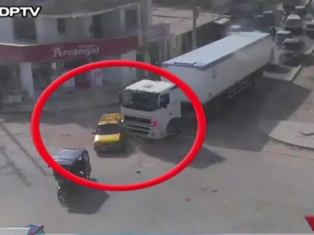 Un violento choque fue captado por las cámaras de seguridad de Piura. Un pesado trailer intentaba virar hacia la derecha cuando impactó un tico y lo arrastró varios metros hasta que lo vio debajo.