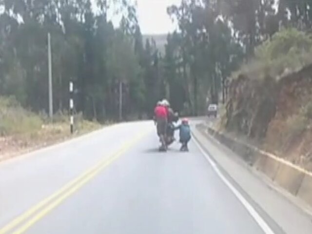 Un video registrado en una carretera de Cajamarca, muestra cómo dos jóvenes arriesgan sus vidas al trasladarse en sus skate por la transitada vía. En las imágenes se logra observar a estas irresponsables personas cogiéndose de la parte posterior de una motocicleta lineal. En el Callao, una mototaxi es registrada trasladándose con exceso de carga. Estas imágenes fueron enviadas por televidentes al WhatsApp de Panamericana Televisión.