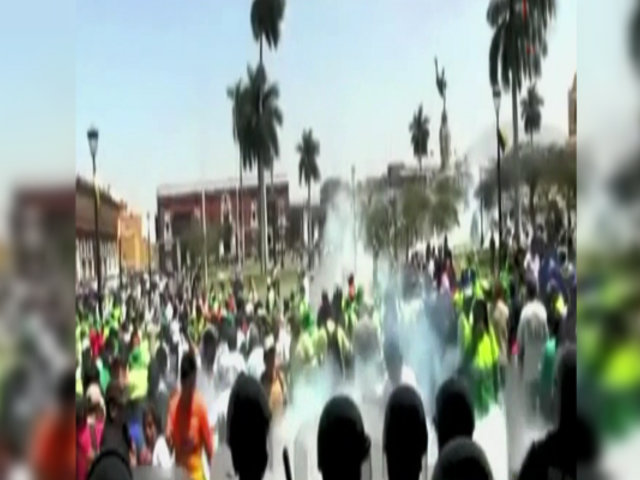 Decenas de trabajadores del Servicio de Gestión Ambiental de Trujillo se enfrentaron a la Policía, frente a la plaza de armas de la ciudad. Producto de los gases lacrimógenos, una mujer sufrió un desmayo y fue atendida rápidamente por sus compañeros.