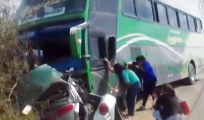 Un lamentable accidente de tránsito ocurrió este fin de semana y dejó como saldo dos personas muertas en la vía que conduce de Piura a Chulucanas. Según testigos indicaron que el conductor del auto conducía a excesiva velocidad cuando la unidad invadió el carril contrario e impacto frontalmente con un bus interprovincial. Tras el aparatoso impacto el auto quedó destruido pues el choque con el bus provocó que terminara debajo del vehículo pesado. Julio Edwin Pulache Alama, de 25 años, el conductor del ómnibus fue trasladado hasta la comisaria del sector para brindar su manifestación.