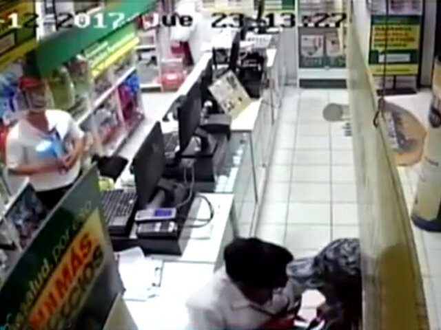 En Casma, delincuentes armados asaltaron una farmacia y se llevaron más de tres mil. Cámaras de seguridad del establecimiento captaron el momento preciso en que los hampones se apoderan del dinero de las ventas del día.