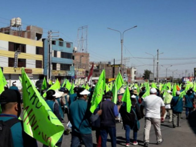 En el segundo día de paro indefinido en contra del proyecto Tía María, cientos de trabajadores de construcción civil se concentraron en la plaza central de Arequipa y luego recorrieron las principales calles.