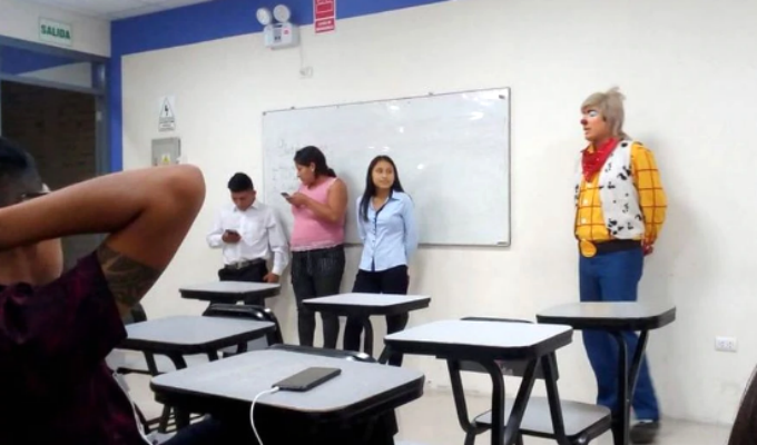 Saliendo adelante. En Facebook se hace viral la historia de un joven que ha conmovido a los internautas por haber sido captado exponiendo en plena clase de la universidad, pero de un modo muy particular: vestido de payaso.