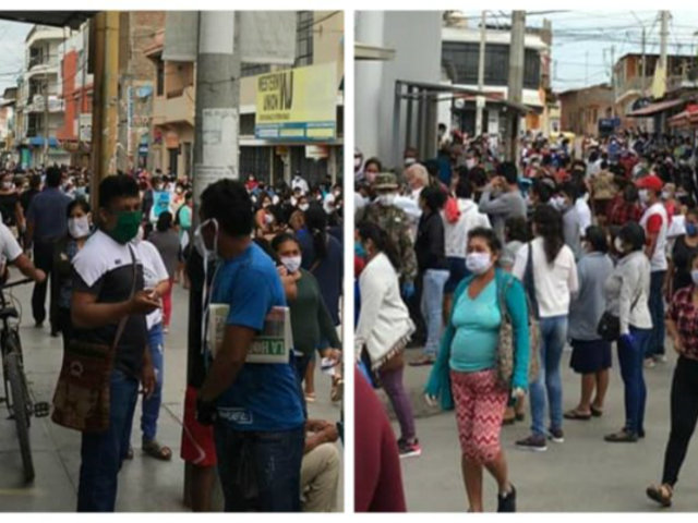 Decenas fueron captados aglomerados, generando desorden y sin tomar distancia social en los exteriores de un banco en Sullana, a fin de cobrar el bono del Gobierno y realizar otras transacciones. La escasa presencia policial en la zona provocó que el caos reine en los exteriores de la entidad bancaria, pese a que muchos usaban mascarilla, no estaban bien colocadas ni mantenían su distancia.
