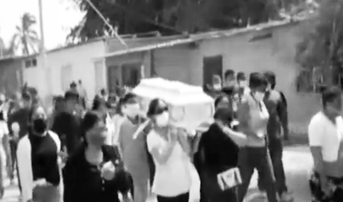 En Piura, un grupo considerable de personas acompaño el féretro de un niño de cinco años que murió a causa de una bala perdida durante una balacera. Estas personas eran conscientes que este tipo de ceremonias están prohibidas pero decidieron salir a la calle acompañando a los familiares del niño que se ha convertido en menos de 10 días en el segundo menor que muere por una bala perdida.