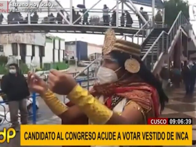 Insólito. El candidato al Congreso por el Partido Popular Cristiano (PPC), Juan Quispe Aguilar, no tuvo mejor idea que acudir vestido de inca e emitir su voto en su local de sufragio en la ciudad de Cusco.