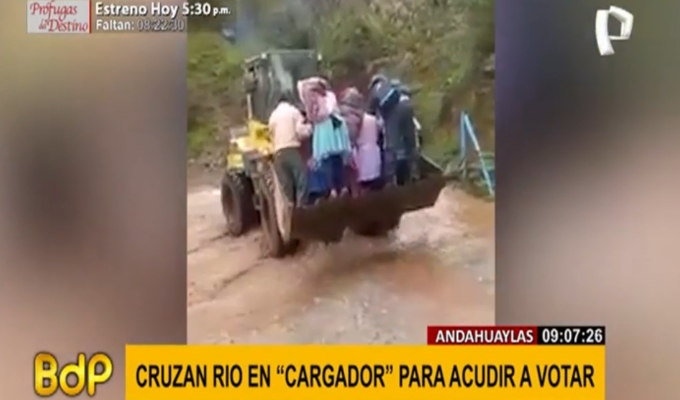 Un grupo de pobladores arriesgaron su vida al subirse al cargador de una maquinaria pesada para cruzar el río Uchuy Mayue, en Andahuaylas, con el propósito de llegar hasta sus locales de votación.