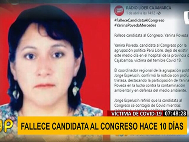La candidata al Congreso por Perú Libre, Yanina Poveda, falleció el primero de abril por coronavirus, en el hospital de la provincia de Cajabamba, señaló un medio regional.