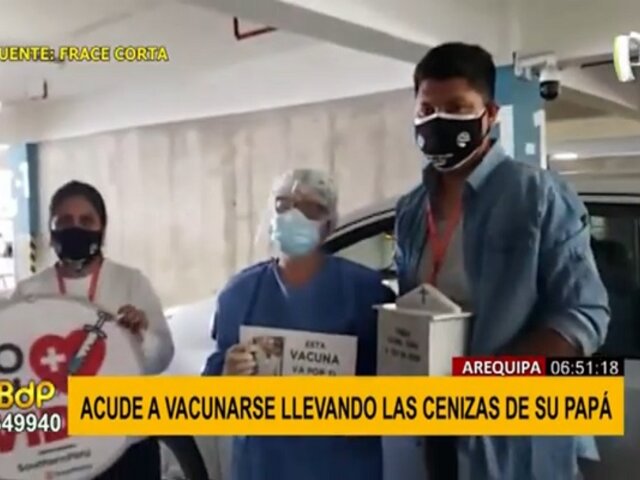 Un joven acudió a un conocido centro comercial de la ciudad de Arequipa para vacunarse y lo hizo junto a las cenizas de su padre, quien falleció por la covid-19 durante la primera ola de la enfermedad.