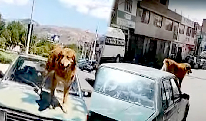 Captan a perro viajando en capó de un vehículo en Ayacucho
