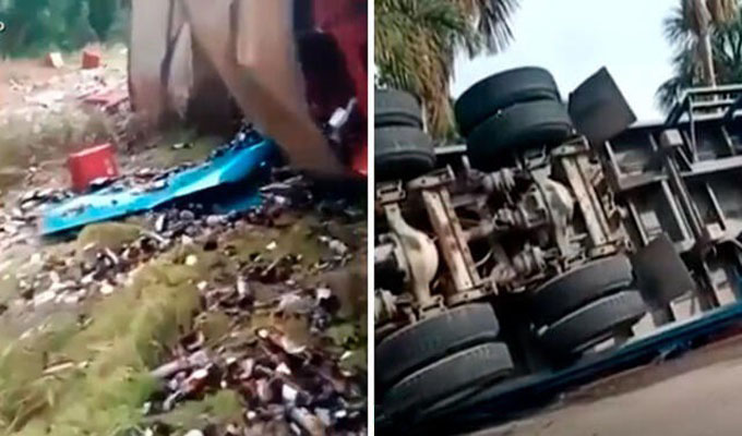 En Pucallpa, un tráiler que transportaba más de 500 cajas de cerveza a la ciudad de Tingo María, se despistó y volcó en el kilómetro 42 de la carretera Federico Basadre, provocando que decenas de botellas quedaran regadas en la vía.