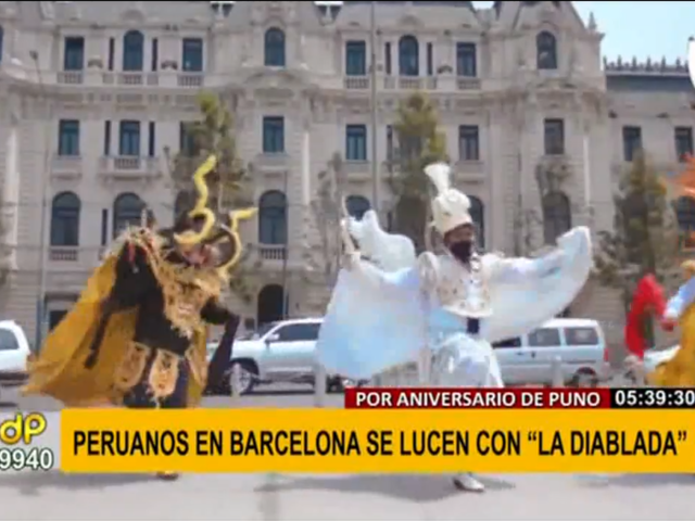 Varios integrantes de esta comunidad de peruanos, residentes en Cataluña, se encuentran presentes en nuestra capital y homenajearon a la ciudad altiplánica danzando una clásica Diablada puneña.