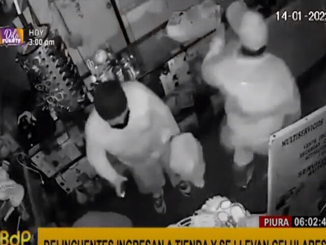 Las cámaras de vigilancia de una tienda de celulares en Piura, registraron el momento en que tres sujetos llegan en horas de la madrugada y luego de romper los candados, ingresan al local para arrasar con celulares de alta gama y equipos tecnológicos.