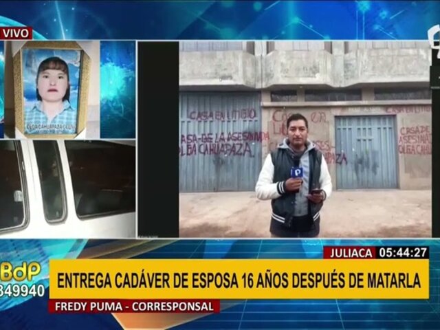 El cuerpo de Olga Cahuapaza, quien había sido asesinada hace 16 años por su esposo se encontró enterrado a 22 kilómetros de Juliaca en la vía Juliaca – Huancané. No obstante, médicos forenses realizarán el día de hoy la necropsia correspondiente, puesto que han pasado 16 años, tras el asesinato que recientemente ha salido a la luz. El crimen ha consternado a toda la ciudad de Juliaca.