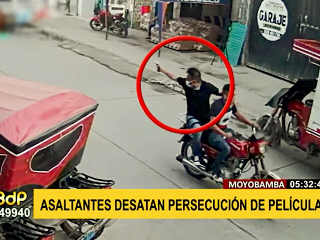 Ni bien iniciaron la persecución, uno de los delincuentes sacó su arma y lanzó disparos al vehículo que los perseguía, todo fue captado por las cámaras de seguridad en las calles de Moyobamba.