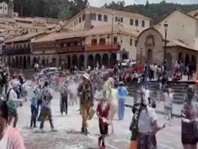 No solo en la ciudad de Cajamarca se vive la algarabía de los carnavales. En Cusco también se festejó en medio de un ambiente lleno de color. Las personas, en su mayoría jóvenes, rodearon a la policía, pero esta vez no para atacarlos con piedras y palos, sino con agua, pintura y espuma.