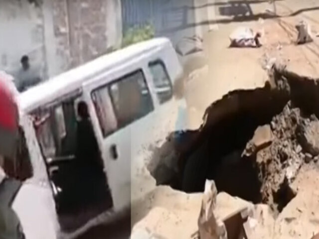 Una camioneta tipo miniván terminó dentro de un enorme forado que se formó en el cruce de las avenidas Panamá y Junín en la ciudad de Chiclayo. Afortunadamente, el conductor no sufrió daños y con ayuda de los vecinos el vehículo pudo ser retirado del hueco, remolcado por un auto.