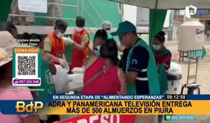 Adra y Panamericana Televisión continúan brindando su apoyo a los más afectados por las lluvias y desbordes a través de la campaña "Alimentando Esperanzas". Esta vez la unidad móvil de ayuda humanitaria llegó hasta el departamento de Piura para repartir más de 500 almuerzos diarios.